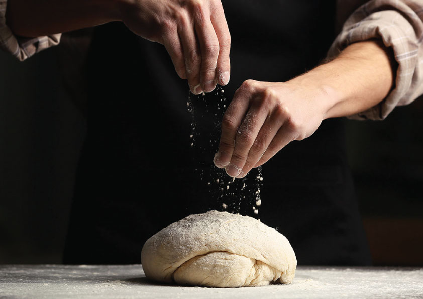 7) Volte a polvilhar a bancada, coloque a massa e molde o pão em bolas, em quadrados, ao seu gosto.